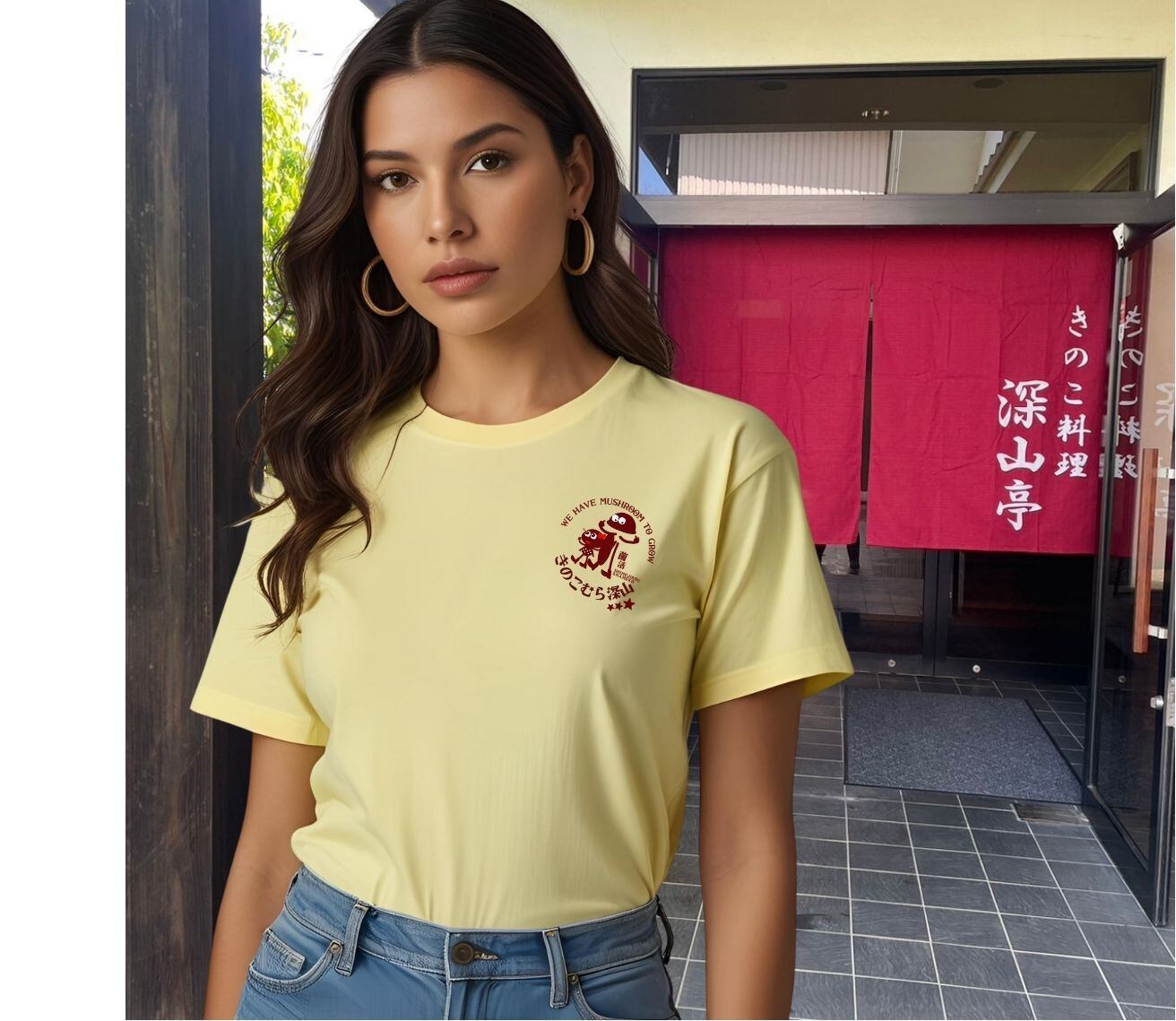 きのこと食のテーマパーク・きのこむら深山のスタッフが着用している元気カラー「ライトイエロー」のTシャツです。左胸に、オリジナルキャラクター「しめじろう」と「なめ子」のシルエットをデザインしたかわいらしいデザインです。